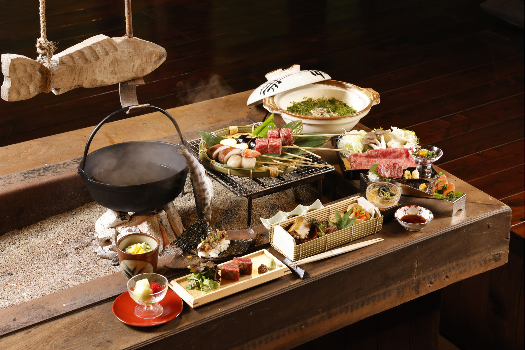 やま星の自慢は、囲炉裏スタイルの本格会席料理。西麻布のミシュラン星付きレストラン「常」監修のもと、素材の旨みを最大限に引き出した逸品が揃います。炭火でじっくり焼き上げる川魚や尾崎牛は、お酒との相性も抜群!