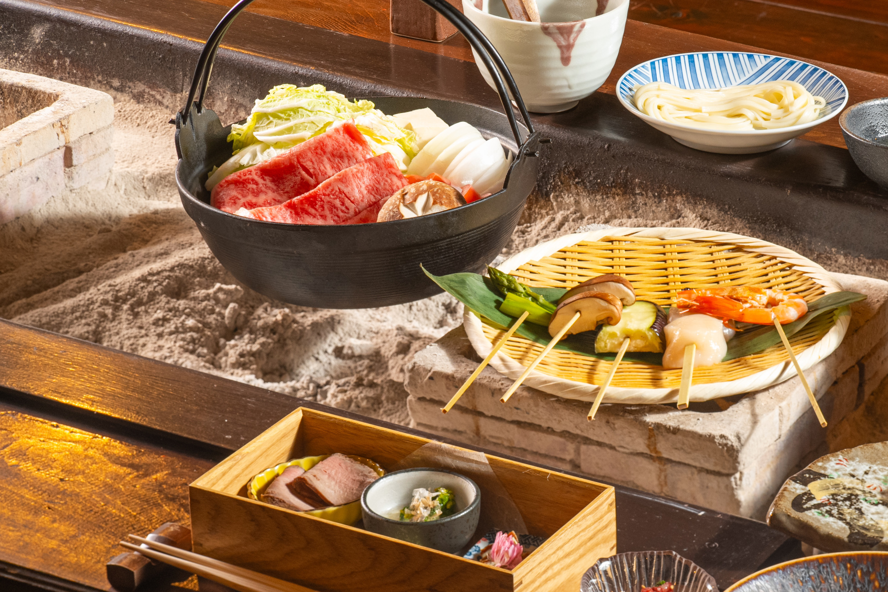 囲炉裏を囲んで、大切な人と語らいながらいただく夕食は、どこか懐かしく、心に残るひとときに。